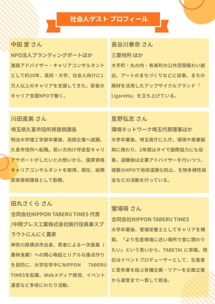 NPO・自治体・民間企業、街づくり・農業・環境保全活動まで様々なソーシャルグッドな社会人のお話が聞けます!